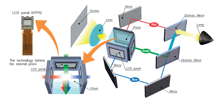 Sơ đồ mô phỏng công nghệ trình chiếu 3LCD trên máy chiếu Epson