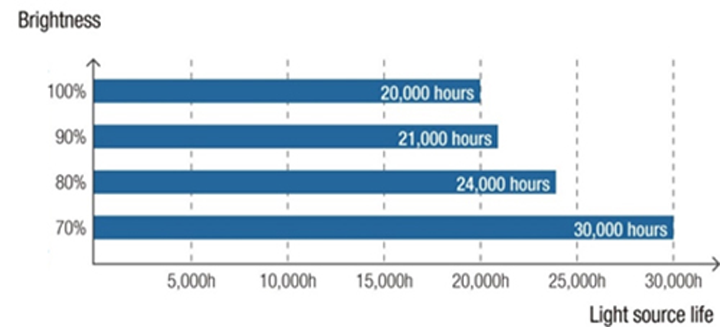 Máy chiếu Epson EB-L520U được trang bị nguồn sáng Laser không chứa thuỷ ngân có tuổi thọ lên tới 30.000 giờ ở chế độ ECO, sử dụng lâu dài mà không cần bảo trì, thay thế đèn, làm giảm tổng chi phí sở hữu.